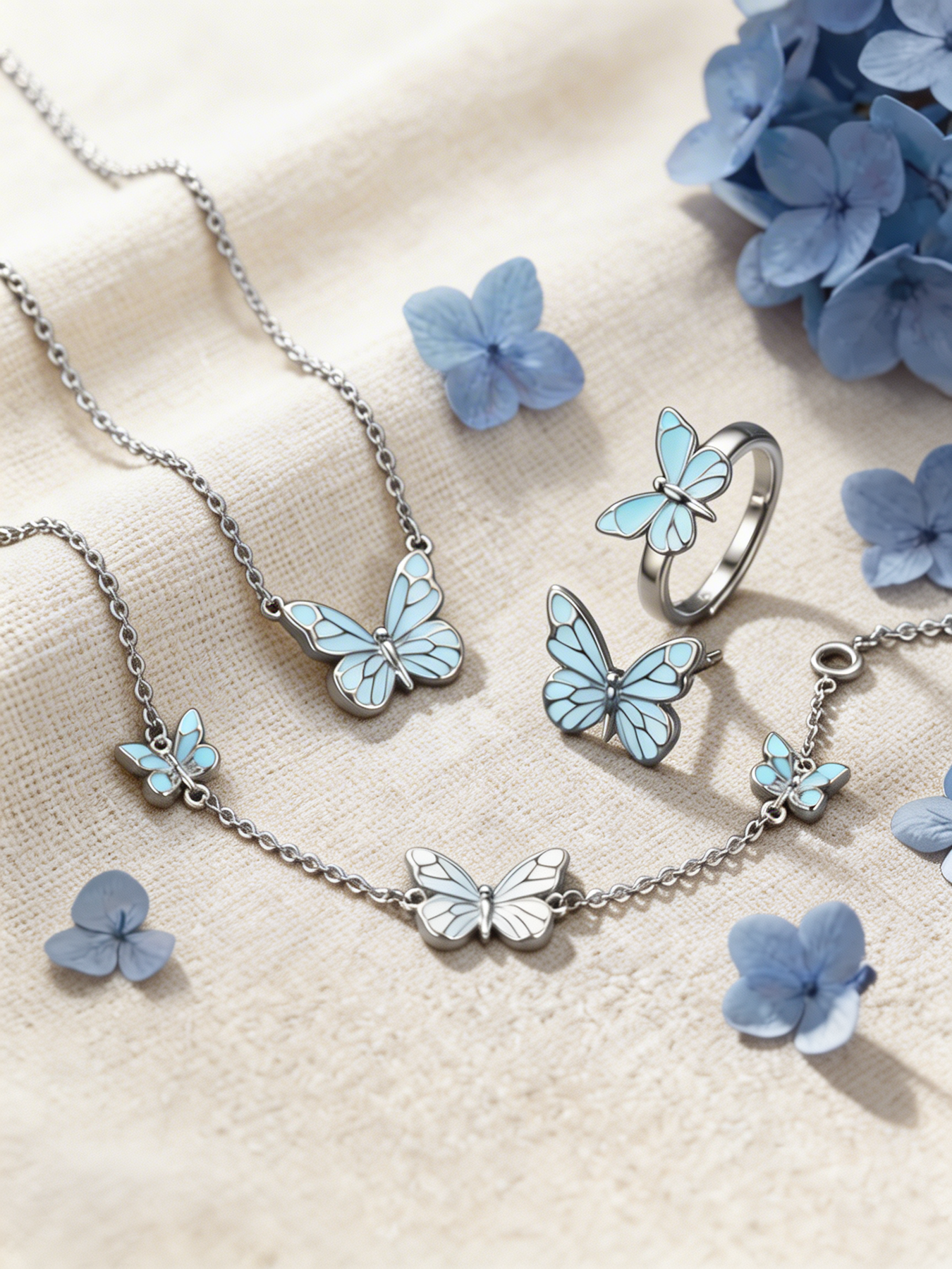 • Vlinderarmband: Wordt geleverd met een slanke ketting en dezelfde serie vlinderbedel. Het zit licht op de pols zonder zwaar aan te voelen en past naadloos bij de ketting.